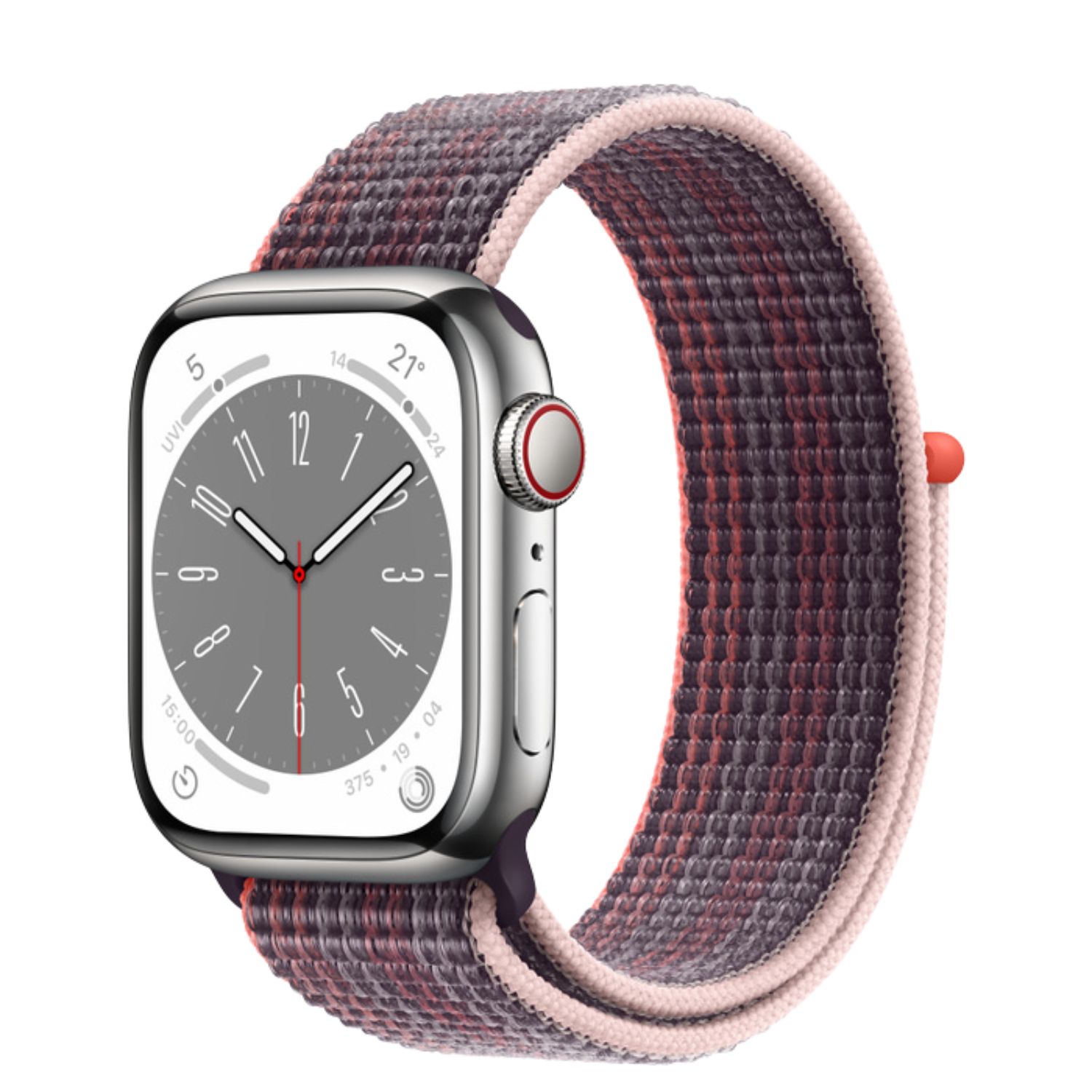 Display: Always-On LTPO OLED Retina 45mm 396-by-484 pixels 41mm 352-by-430 pixels Chip: S8 & W3 & U1 Battery: Up to 18 hours Other: L1 GPS, GLONASS, Galileo, QZSS, & BeiDou Compass Always-on altimeter Blood oxygen sensor Electrical heart sensor Third-generation optical heart sensor International emergency calling Emergency SOS Gyroscope Ambient light sensor Speaker Microphone Apple Pay GymKit
